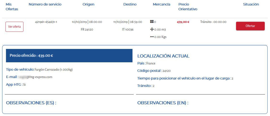 Si estás interesado en alguno de nuestros transportes, puedes presentar una oferta. Para hacerlo, pulsa sobre “Ofertar”.